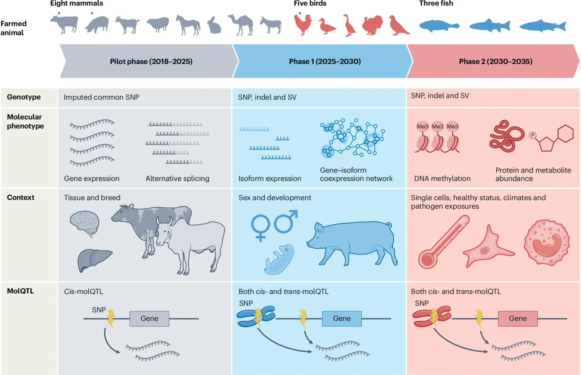 To date, we are considering 16 farmed animal species, including eight mammals (that is, cattle, pigs, goats, sheep, horses, rabbits, camels and donkeys), five birds (that is, chickens, ducks, geese, turkeys and pigeons) and three fish (that is, large yellow croaker, Atlantic salmon and rainbow trout). Additional farmed species will be considered as the project progresses. The regulatory effects of genomic variants on different molecular phenotypes across biological contexts and environmental conditions will be systematically exploited using cis-molQTL and trans-molQTL mapping. Different goals and milestones for the three phases of FarmGTEx are outlined. Asterisks indicate that the pilot phases for these species have been completed. Indel, short insertion and deletion (length less than 50 nucleotides); SNP, single nucleotide polymorphism; SV, structural variants.