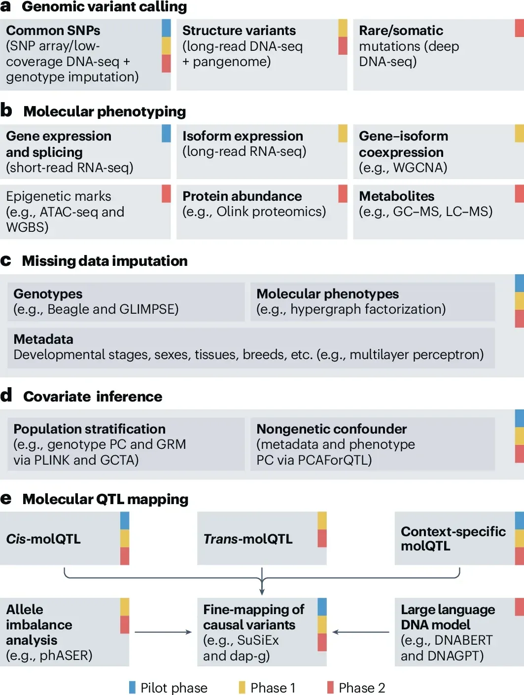 a–e, The flowchart highlights the key stages and methodologies of data generation and analyses across the three phases of FarmGTEx, including genomic variant calling (a), definition and quantification of molecular phenotypes (b), missing data imputation (c), batch effect inference and removal (d), and molQTL mapping via, for example, OmiGA (https://omiga.farmgtex.org) and ClipperQTL (e). Examples of approaches and methods used for each stage are shown in parentheses. ATAC-seq, assay for transposase-accessible chromatin with sequencing; dap-g, deterministic approximation of posteriors: genetics; DNABERT; DNAGPT; DNA-seq, DNA sequencing; GC–MS, gas chromatography–mass spectrometry; GCTA, a tool for genome-wide complex trait analysis; GRM, genetic relationship matrix; GLIMPSE, genotype likelihoods imputation and phasing method; LC–MS, liquid chromatography–mass spectrometry; PC, principal component; PLINK, a tool for whole-genome association and linkage analyses; phASER, phasing and allele-specific expression from RNA-seq; SuSiEx, an enhanced tool for cross-ancestry fine-mapping of causal variants based on ‘sum of single effects’; WGBS, whole-genome bisulfite sequencing; WGCNA, weighted gene coexpression network analysis.